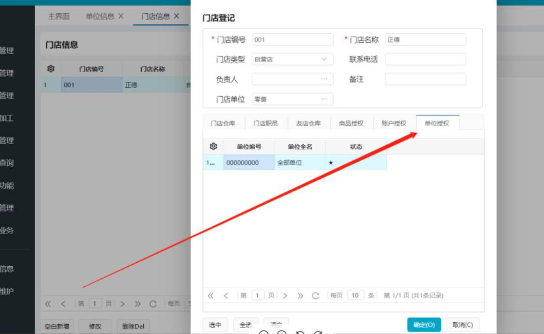 注意:如果是ERP16.X系列版本,第2个步骤的权限已经移动到了基本信息---门店信息中,需要在这里面针对单位进行授权。