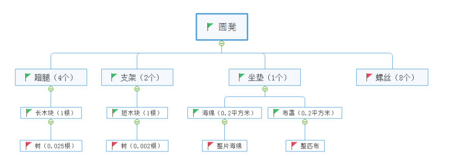 2、建立以下BOM清单,海绵和布罩的原材料比例设置为0.2,损耗率设置为25%
