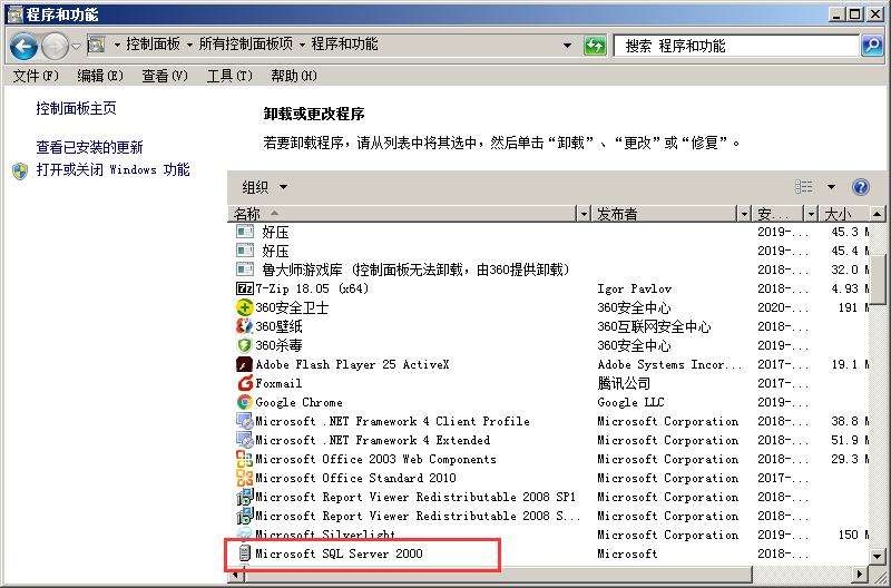 最直观的知道这个是msde数据库需要打开【控制面板】,点开【程序和功能】,进入到卸载程序的界面,这里面可以看到数据库的程序,msde数据库的程序名称首字母缩写就是msde,完整名称是:Microsoft SQL Server Desktop Engine;看截图: