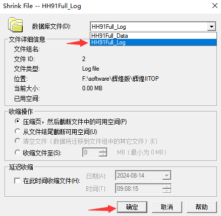 4、再次右击数据库——任务——收缩 ——收缩数据库——文件——选择Log后缀的选项——确定
