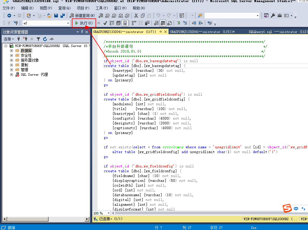 6.打开脚本文件后可以看很多 sql 语句,这时点击命令栏中的!“执行开始执行升级语句