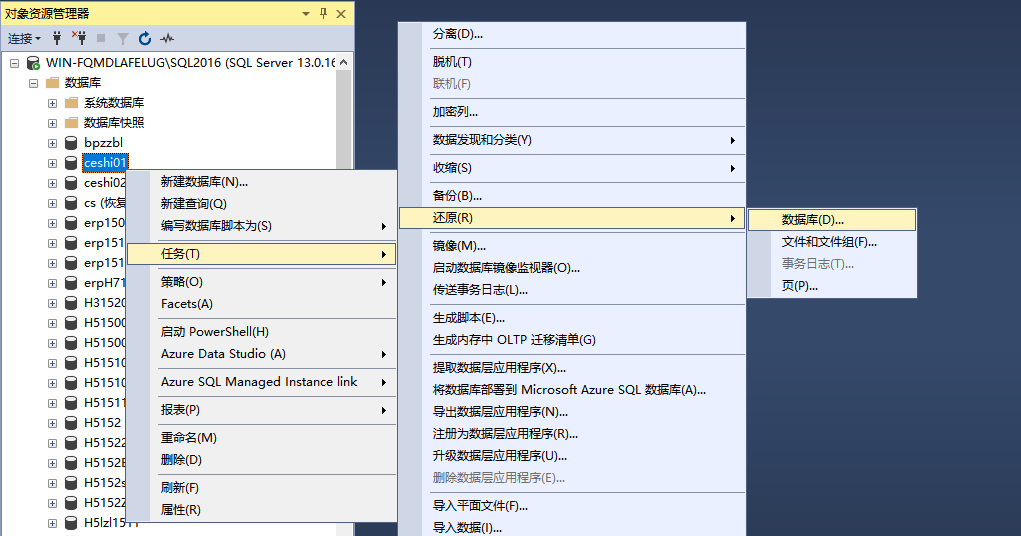 2、选择您要还原的数据库(如果没有数据库可选,可以新建一个账套之后,在新建账套的数据库上来还原),点击鼠标右键---任务---还原---数据库。