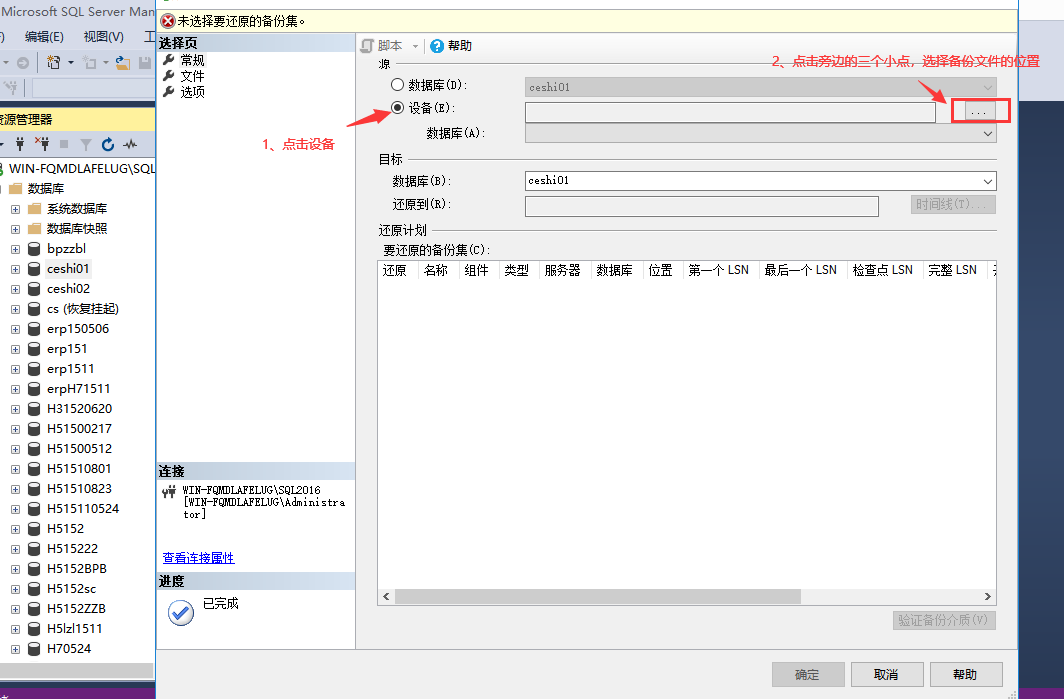 3、在还原数据库的界面中,选项选择未【设备】,并点击旁边的【三个小点】的按钮选择备份文件的位置。
