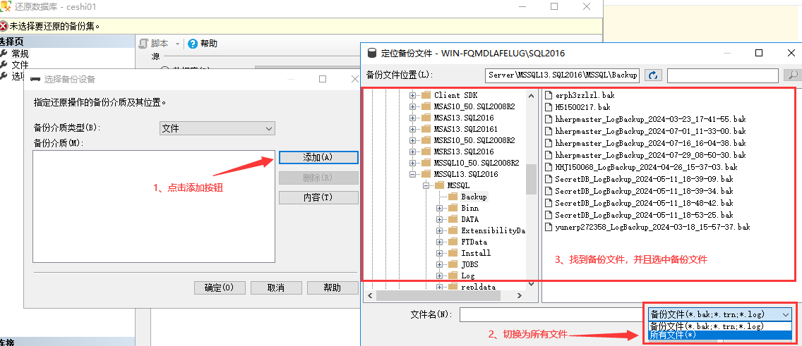 4、在接下来弹出的选择备份设备的弹窗中,文件格式选择为【所有文件】之后,找到并选中需要恢复的备份文件,点击确定。