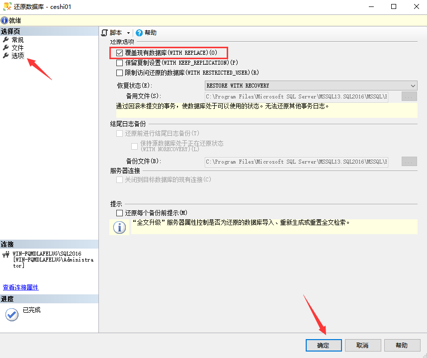 6、接下来我们切换到【选项】页面,勾选【覆盖现有数据库】选项之后,点击确定,等待恢复完成即可。