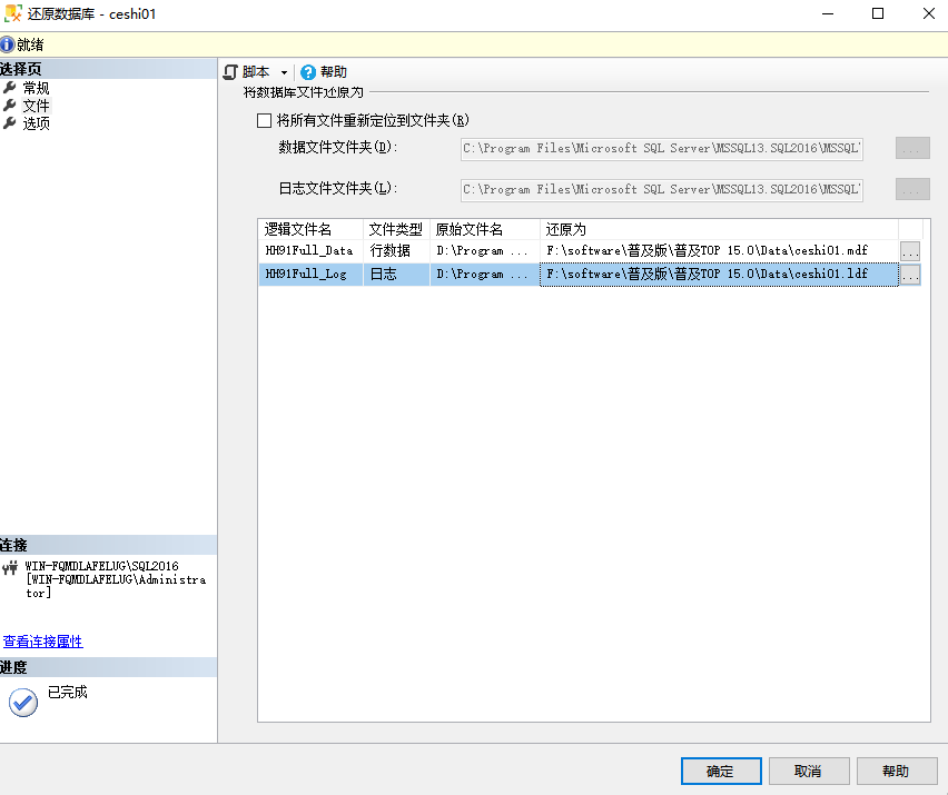 5、选中备份之后,切换到【文件】页面,将【还原为】的路径修改为:【软件安装文件夹路径 \data\帐套数据库名 .mdf】以及【软件安装文件夹路径 \data\帐套数据库名 .ldf】的格式。