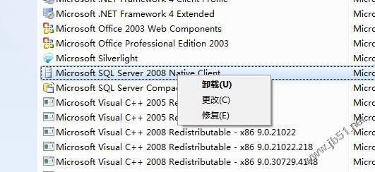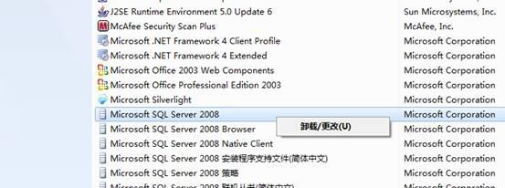 3、在程序列表中找到"Microsoft SQL Server 2008",右击 选"卸载"(或双击)。