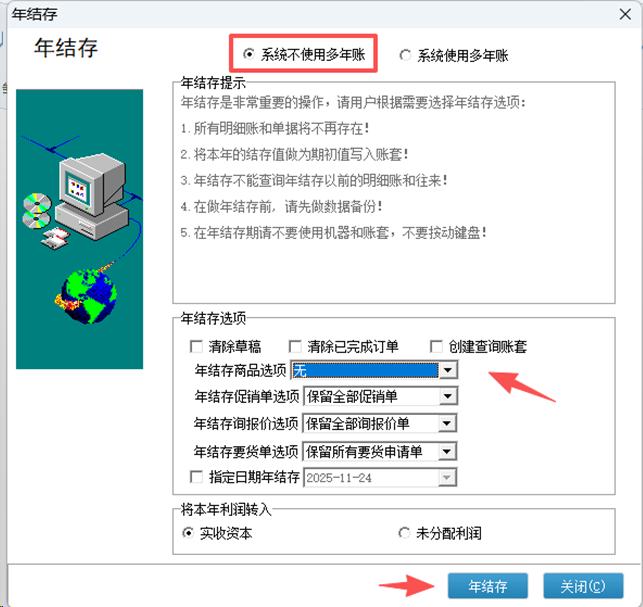6、指定日期年结存:这是非多年帐中的另一种年结存方式,后面将会介绍,这里不做具体说明。
