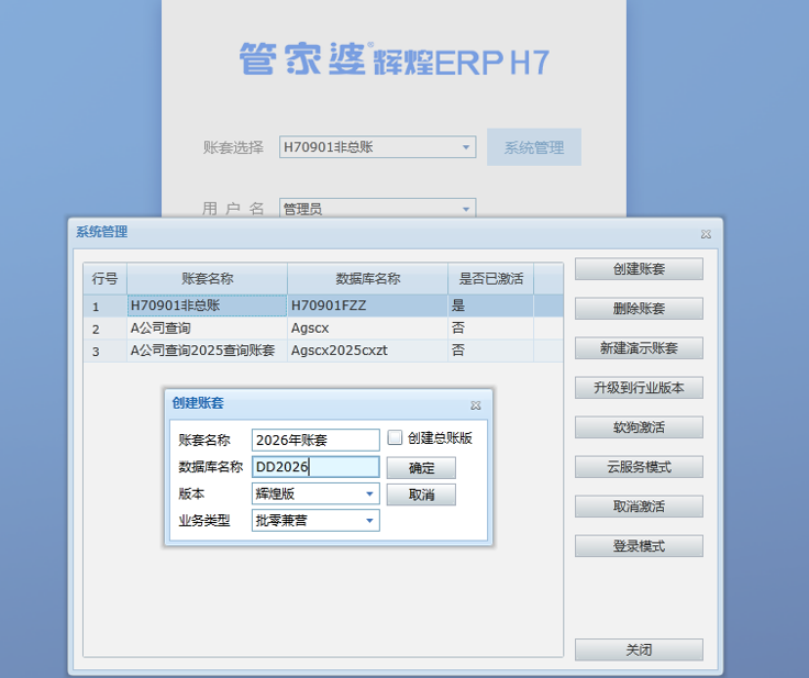 1、新建一个账套,登陆软件到选择账套那一步的时候,选择创建,创建一个新的账套,这个账套作为【年结存后的查询账套】来使用或者用于年结存。