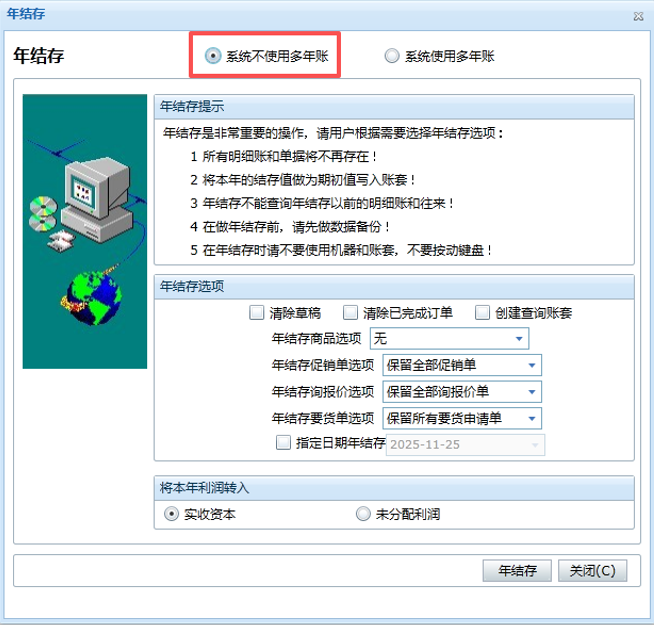 f.指定日期年结存:这是非多年帐中的另一种年结存方式,后面将会介绍,这里不做具体说明。