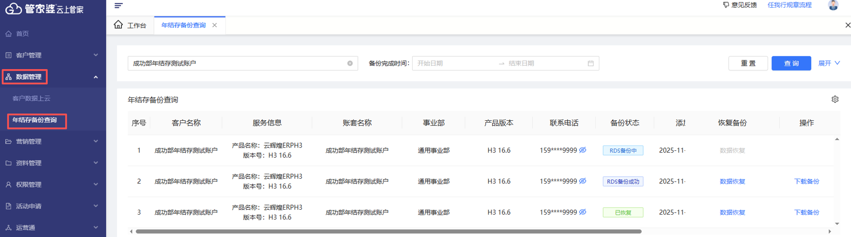 1、请【代理朋友】在云上管家【代理端】——数据管理——年结存备份查询,搜索客户名称或者客户对应服务的手机号,找到对应时间点的年结存备份数据,点击恢复数据。