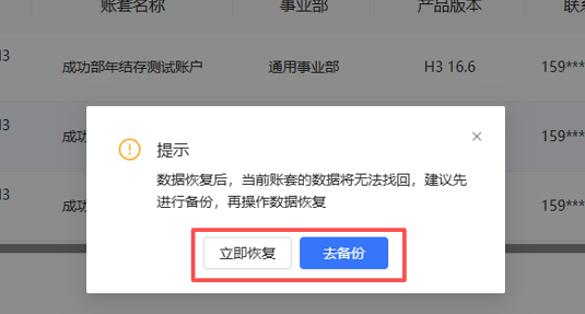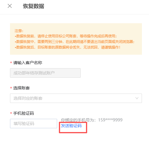 点击【立即恢复】会有界面可以选择需要年结存前备份恢复的账套,选择对应账套之后,点击【发送验证码】,会有验证码发送到客户对应手机号手机上,然后录入验证码,数据开始恢复,状态为【已恢复】后表示数据恢复成功,请登录账套确认数据