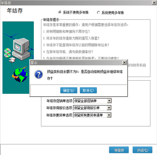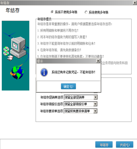 如果存在未记账凭证,年结存的时候也会有相关提示【系统有未记账凭证,不能年结存!】