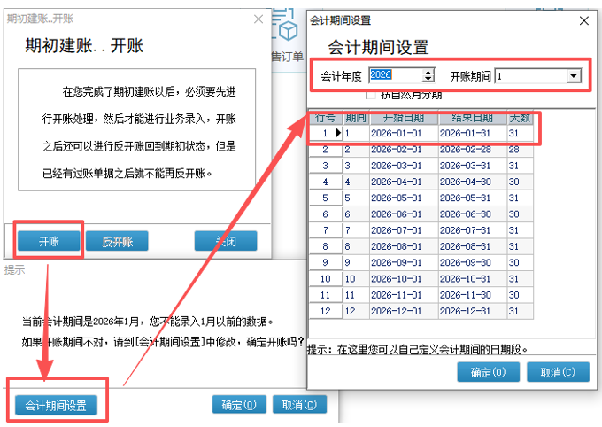 这个时候需要注意的时间范围,选择的这个期间就为系统开账日期。
